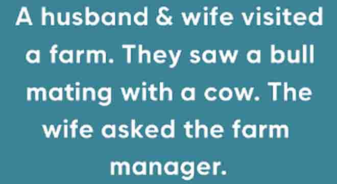 suggest a suitable headline: A husband & wife visited a farm. They saw a bull mating with a cow. The wife asked the farm manager.
